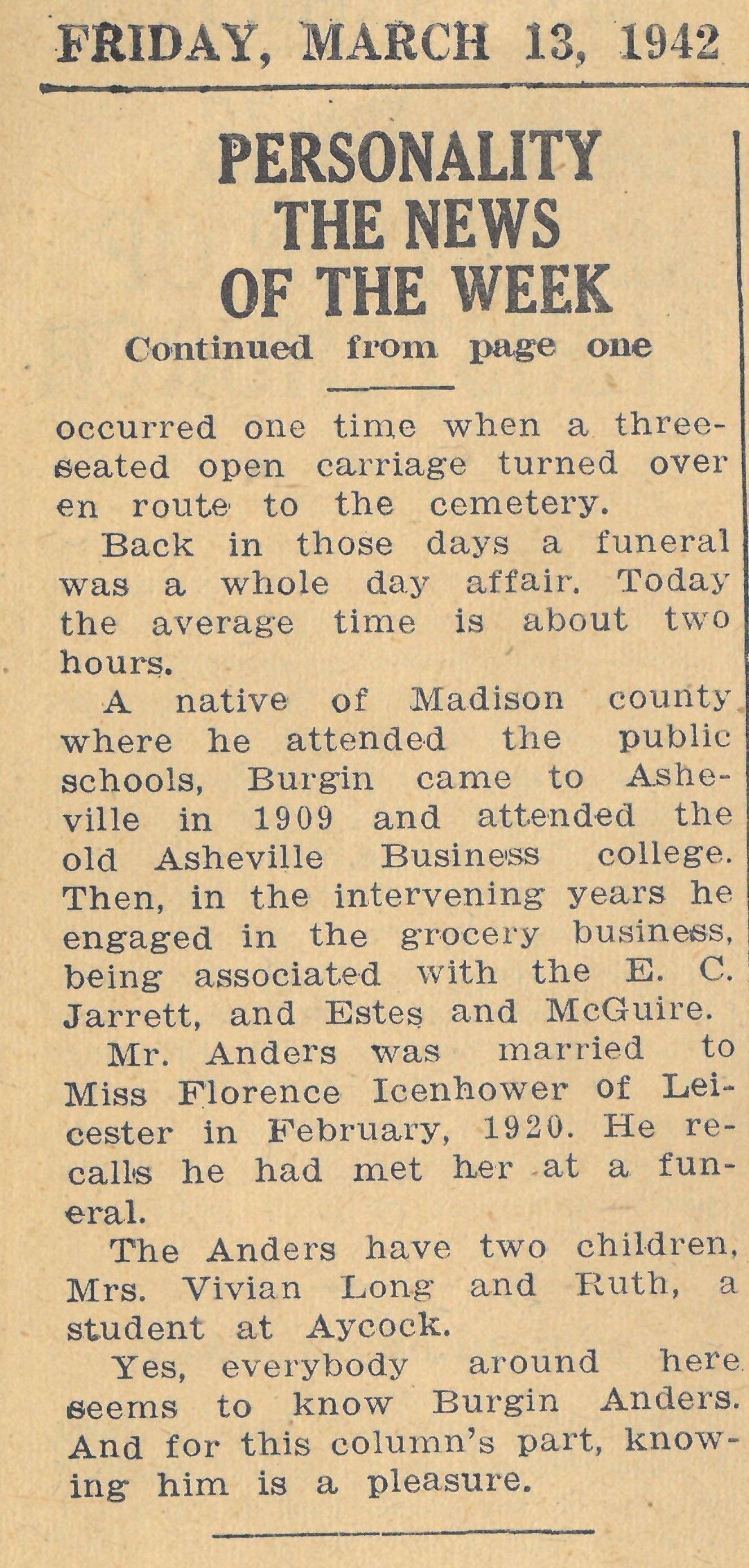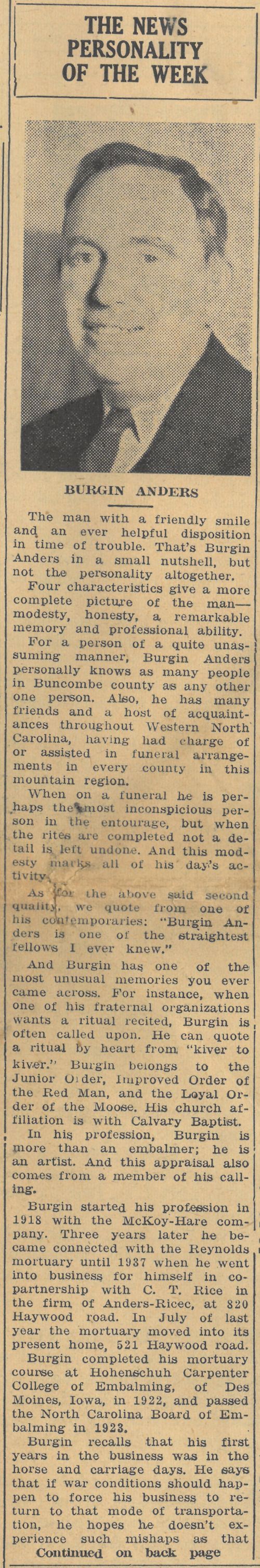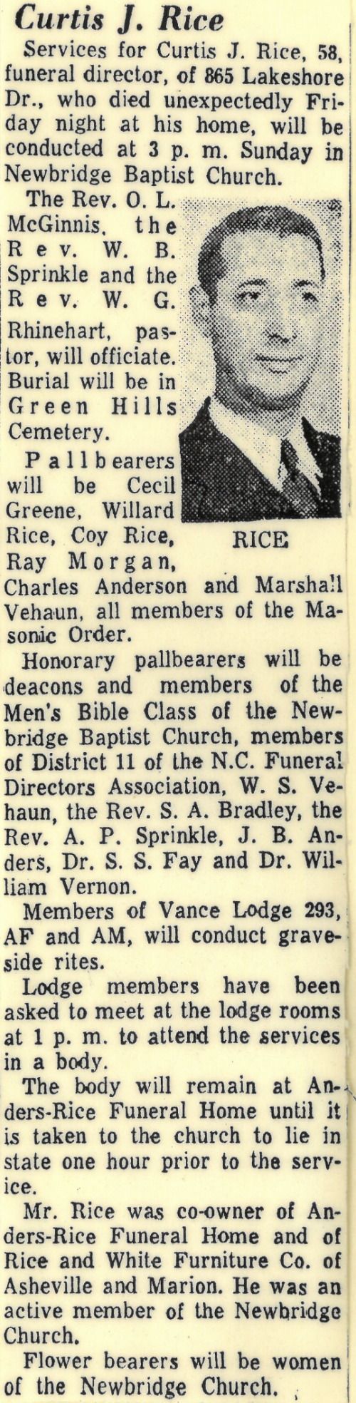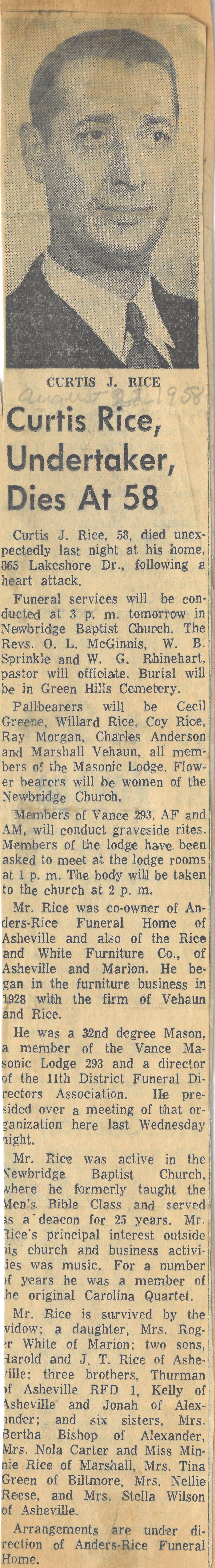 The funeral home made its beginning on July 1, 1937, on Haywood Road in West Asheville. Our founders were J.B. Burgin Anders, C.J. "Curtis" Rice, and the Rev. W.S. "Scott" Vehaun, all of whom provided the foundation, professionalism, and reputation we are proud of today.