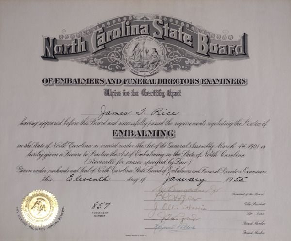 He has been a licensed funeral director since 1976, a licensed embalmer since 1979, and he holds his N.C. Life Insurance License.